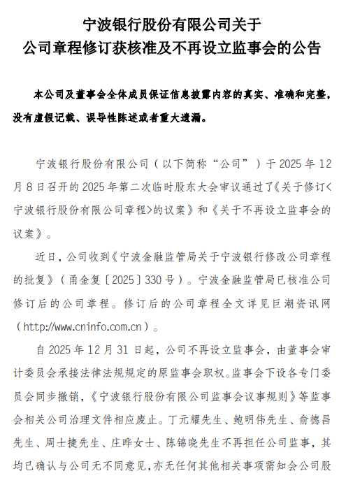 宁波银行表示,自2025年12月31日起,公司不再设立监事会,由董事会审计委员会承接法律法规规定的原监事会职权。监事会下设各专门委员会同步撤销,《宁波银行股份有限公司监事会议事规则》等监事会相关公司治理文件相应废止。丁元耀、鲍明伟、俞德昌、周士捷、庄晔、陈锦晓不再担任公司监事,其均已确认与公司无不同意见,亦无任何其他相关事项需知会公司股东及债权人。公司对各位监事在任职期间作出的贡献给予高度评价并致以衷心的感谢。