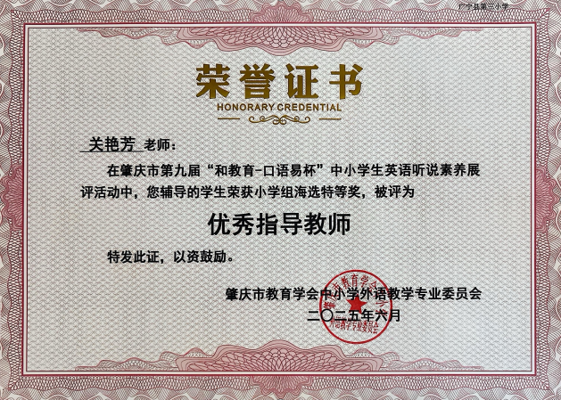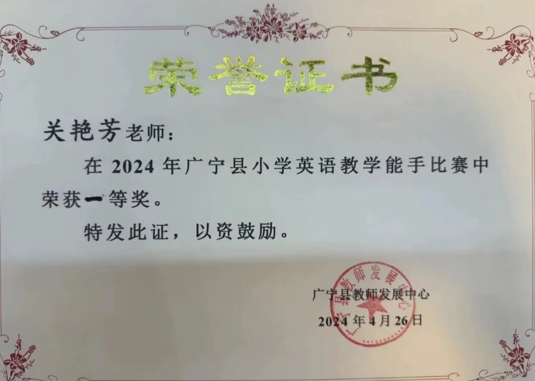 关艳芳老师认真吸收师傅的经验,将其运用到课堂教学中,所带班级连续三年在县抽测中稳居第一,2024年获县小学英语教学能手比赛一等奖,三年间累计获奖11次,辅导的学生也多次在市级竞赛中获奖。关艳芳在采访中说:“钟老师的课堂总是充满激情,她让我坚信教育是充满爱的事业,也让我明白好的教学方法能让孩子真正爱上学习。”