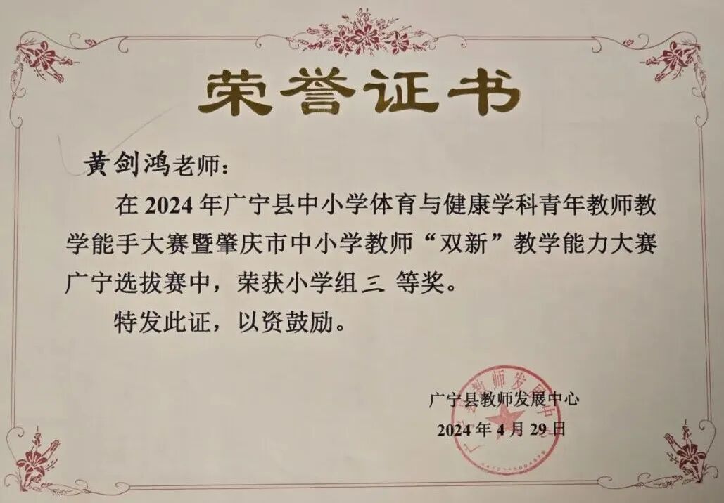 两人共同研究的跳绳训练方案不仅让学校在省、市、县级比赛中屡获团体奖项,黄剑鸿老师还斩获县体育教师教学技能大赛三等奖。