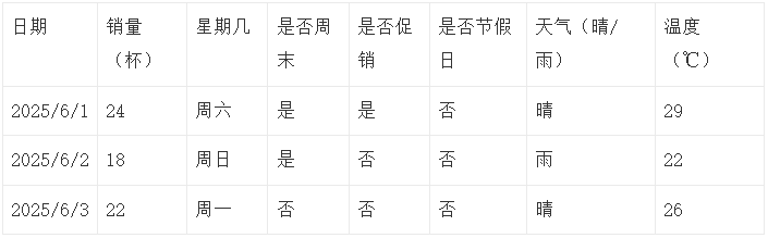 下面我们来实操一下,比如我有一些数据,想用线性回归做预测,怎么操作?一步步教你!假设你的数据表包含以下字段: