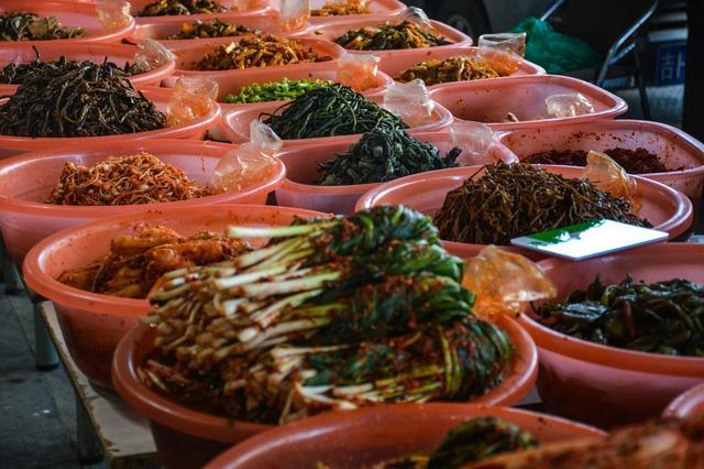 早市的灵魂?必须是那些红红火火、五花八门的泡菜!大大小小的缸子里,萝卜块、白菜帮、桔梗、苏子叶……全在红彤彤的酱料里泡得透透的,散发着酸辣脆爽的诱惑,种类多到让人犯选择困难症。我的经验是:走之前,多买几样带回家!信我,每种泡菜都会在某个时候给你惊喜,让你忍不住想起延吉的味道。