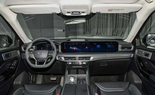 坐进2025款福特探险者的前排,内饰给人的感觉是简洁且规整。中控台采用对称式布局,没有过多复杂的线条,大部分功能都被整合进了那块27英寸的大屏里,分辨率达到4032x756,像素密度152PPI,显示效果比较细腻,操作起来响应速度也跟得上,这得益于它搭载的高通骁龙8155芯片和SYNC车载智能系统。屏幕下方保留了常用的实体按键,比如音量调节和空调开关,盲操起来比较顺手。手机互联方面,它支持CarPlay,连接过程比较稳定,日常听歌导航都能搞定。方向盘是皮质包裹的,尺寸适中,支持上下和前后调节,握感厚实,上面集成了多功能按键和换挡拨片,还有加热功能,冬天用着会比较舒服。换挡机构采用电子式旋钮,造型小巧,刚开始可能需要适应一下,但熟悉之后操作起来挺方便。音响方面,它配备了6个扬声器,虽然没有品牌加持,但音质表现比较均衡,应对日常听歌看视频足够了。